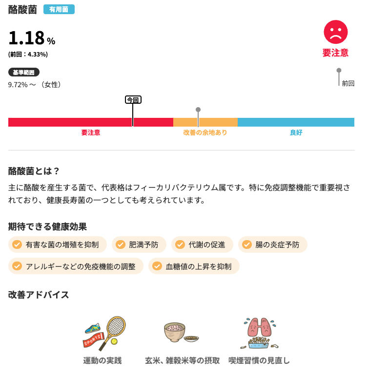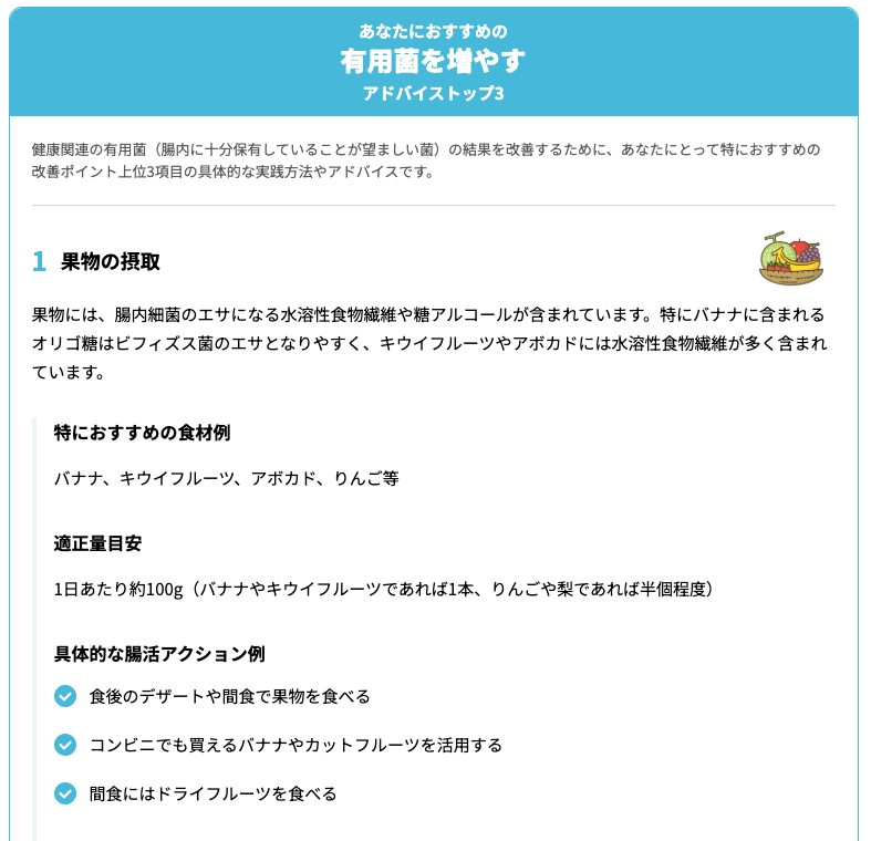 腸活を続ける中で「次は何をしよう?」と迷ったら、必ず検査結果の「改善アドバイス」の項目に立ち返りましょう。そこには、あなたの腸内環境にとって最も優先すべきことが書かれています。このアドバイスを実践していくことが、腸活の成果をより早く実感することにつながり、モチベーションの維持にもなります。